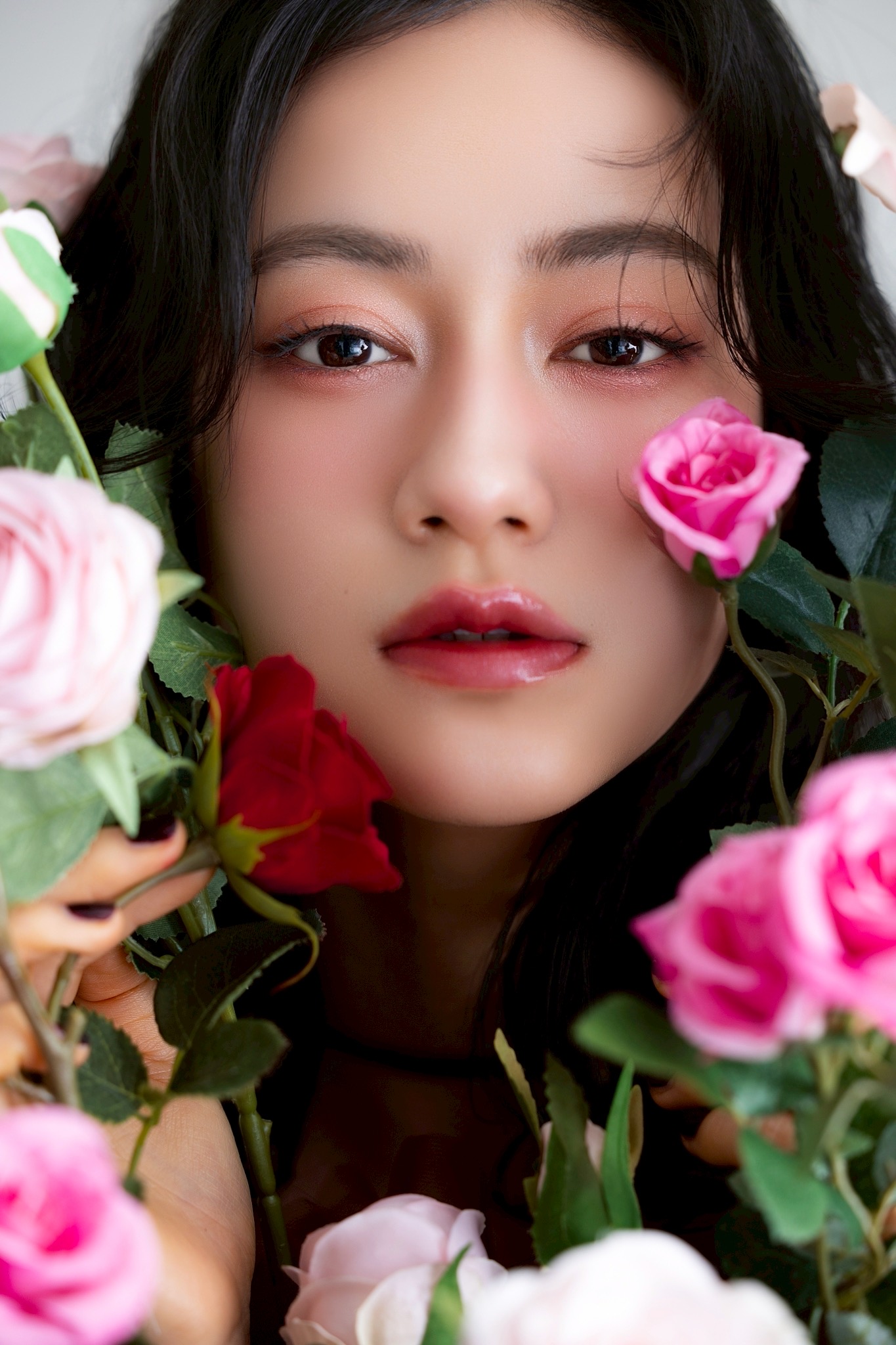 2枚目は、お花に囲まれた多幸感あふれる血色感メイク。