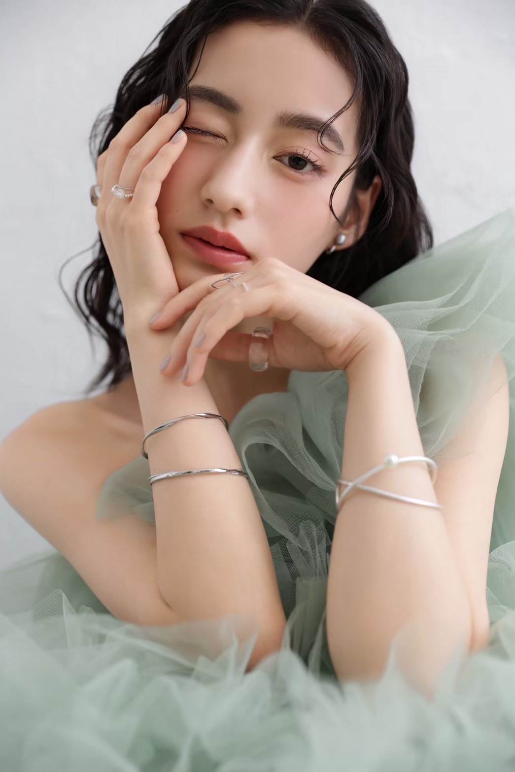 1枚目の写真は、ミントグリーンのドレスに合わせたニュアンスメイク。