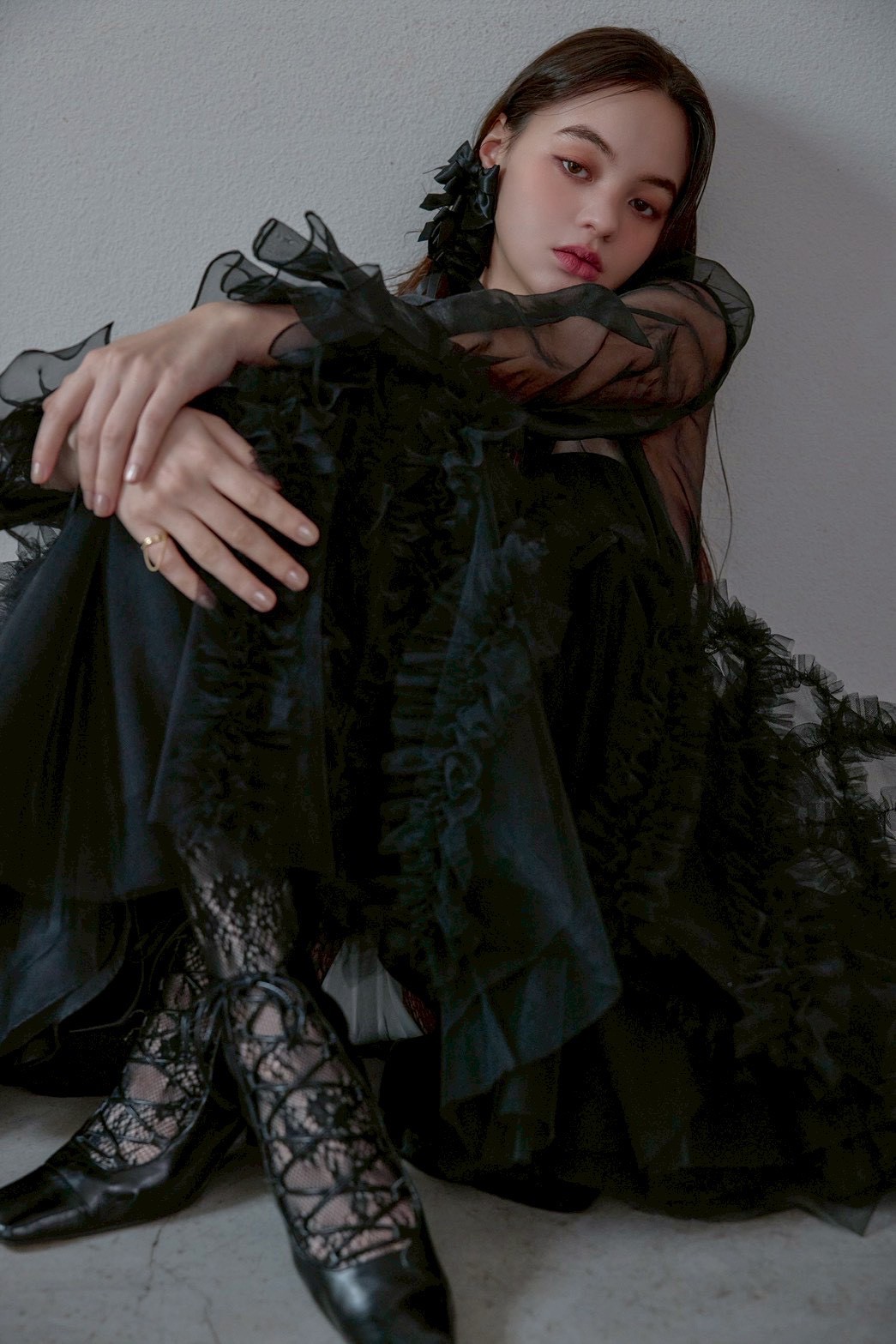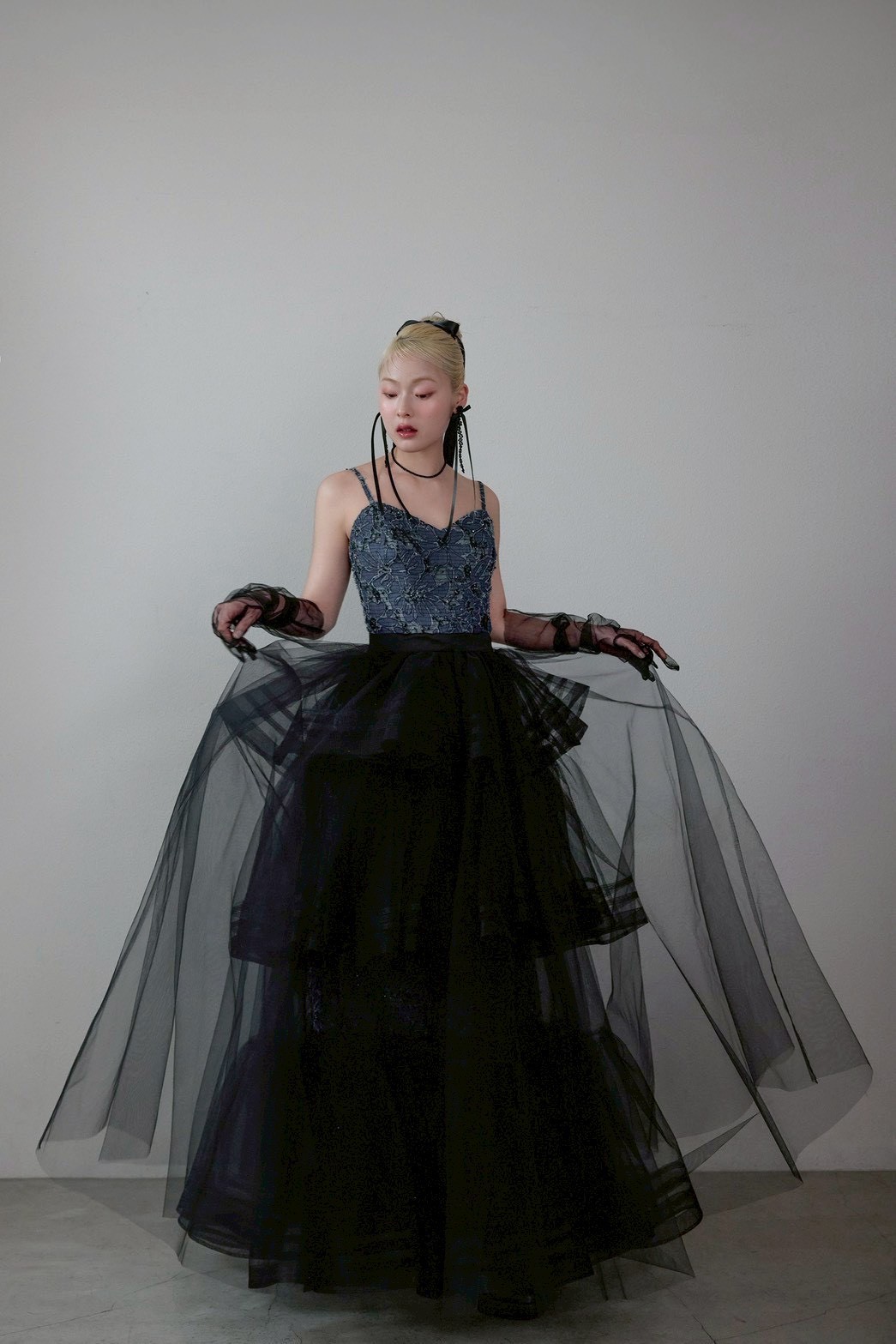 肌を透かすシアーなトップと、ドラマチックに広がるドレスライン。