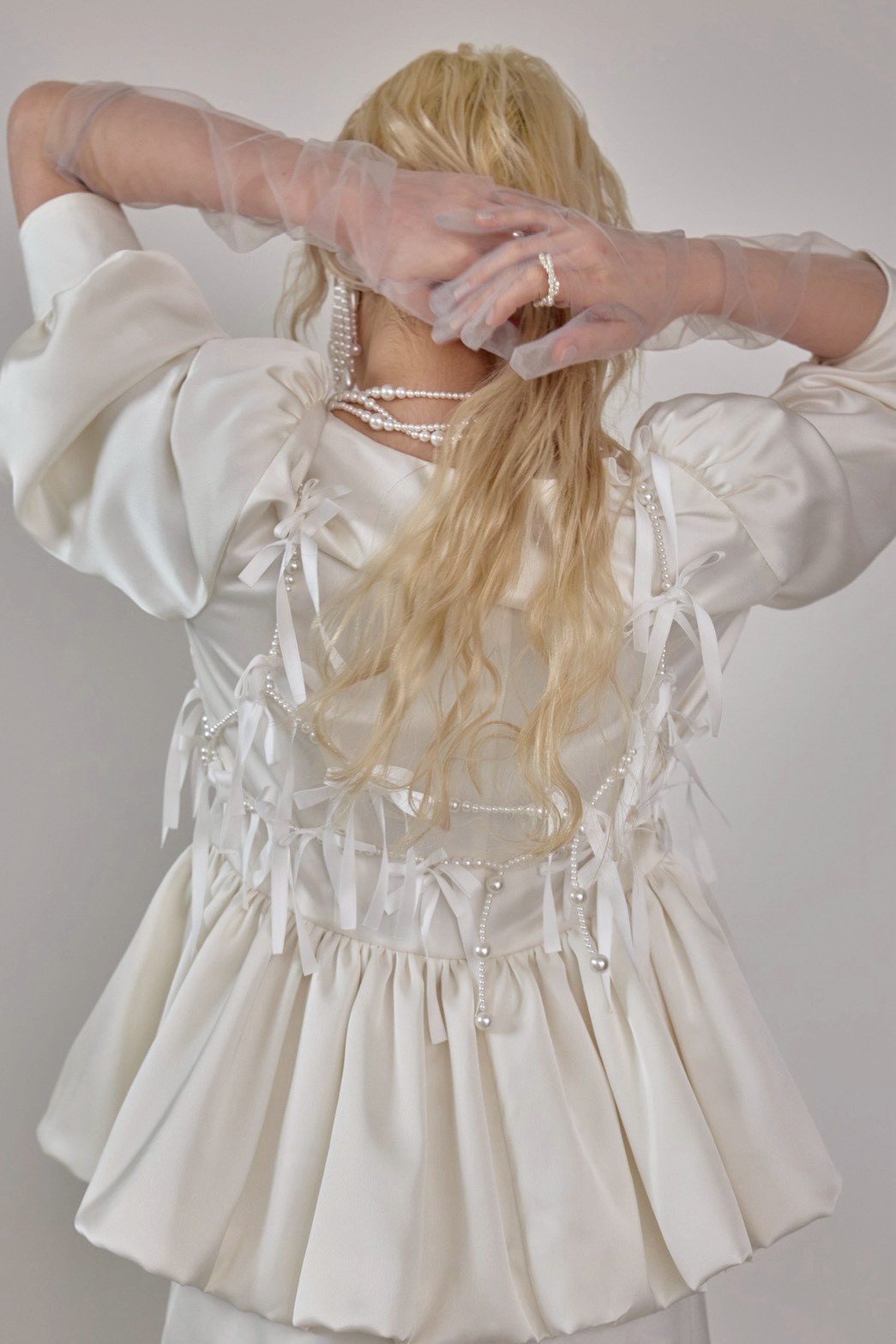 パールリボンビスチェやシアーなグローブが、クラシカルな装いに遊び心をプラスする。