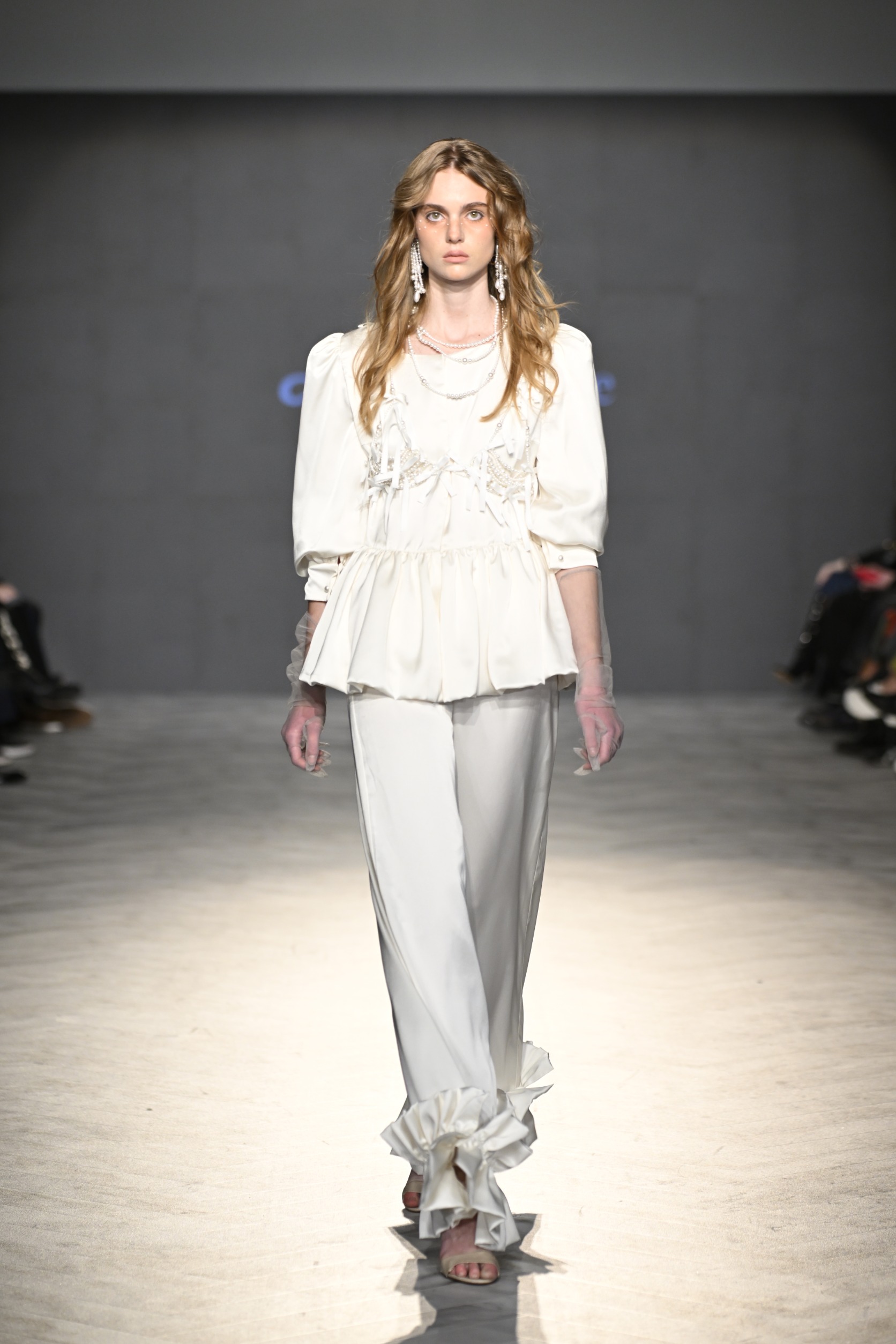 パールの煌めきを纏ったペプラムトップスと、シルキーなパンツの質感が生み出す洗練されたシルエット。