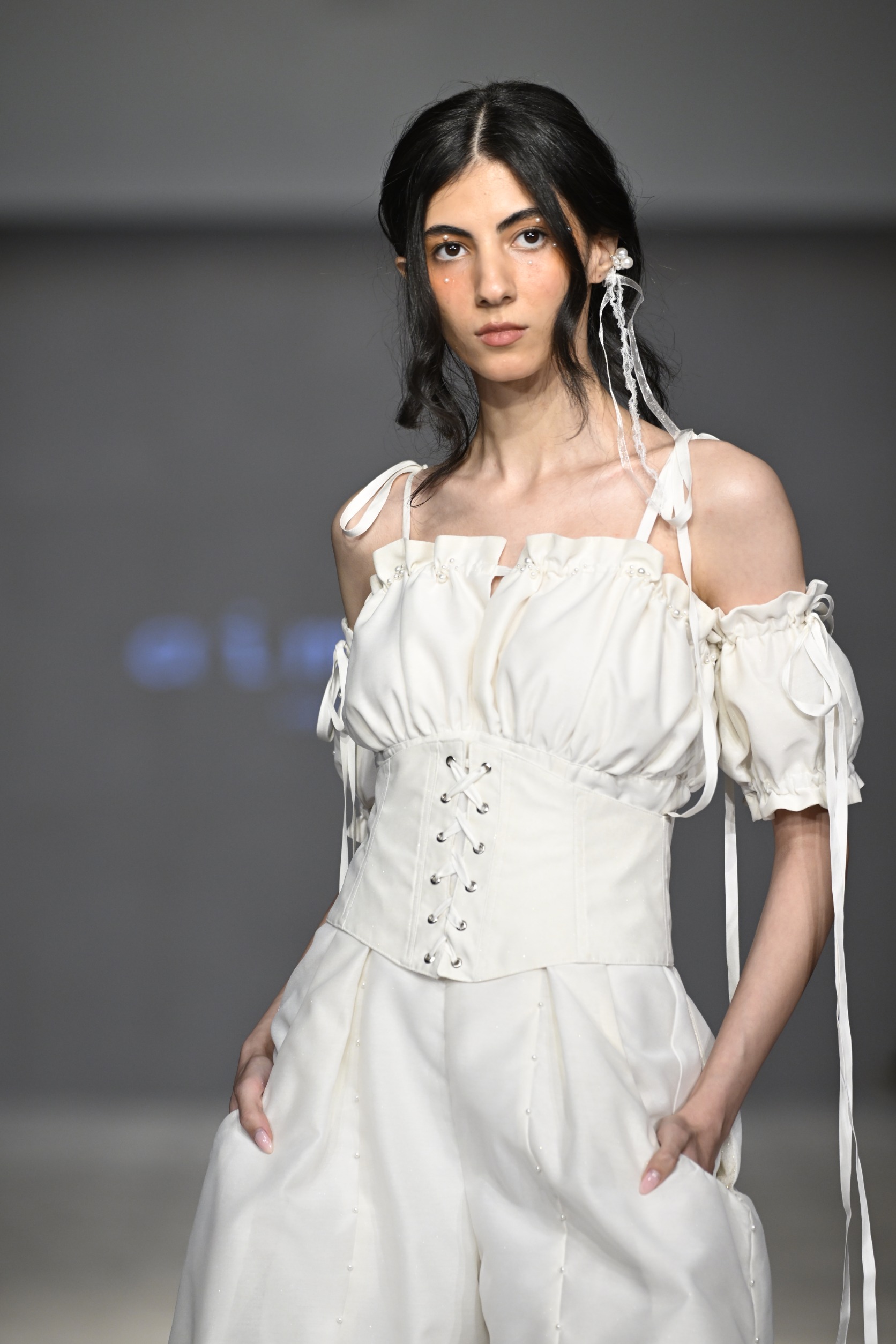 コルセットの構築的なラインと、パフスリーブが生み出す立体的なコントラスト。