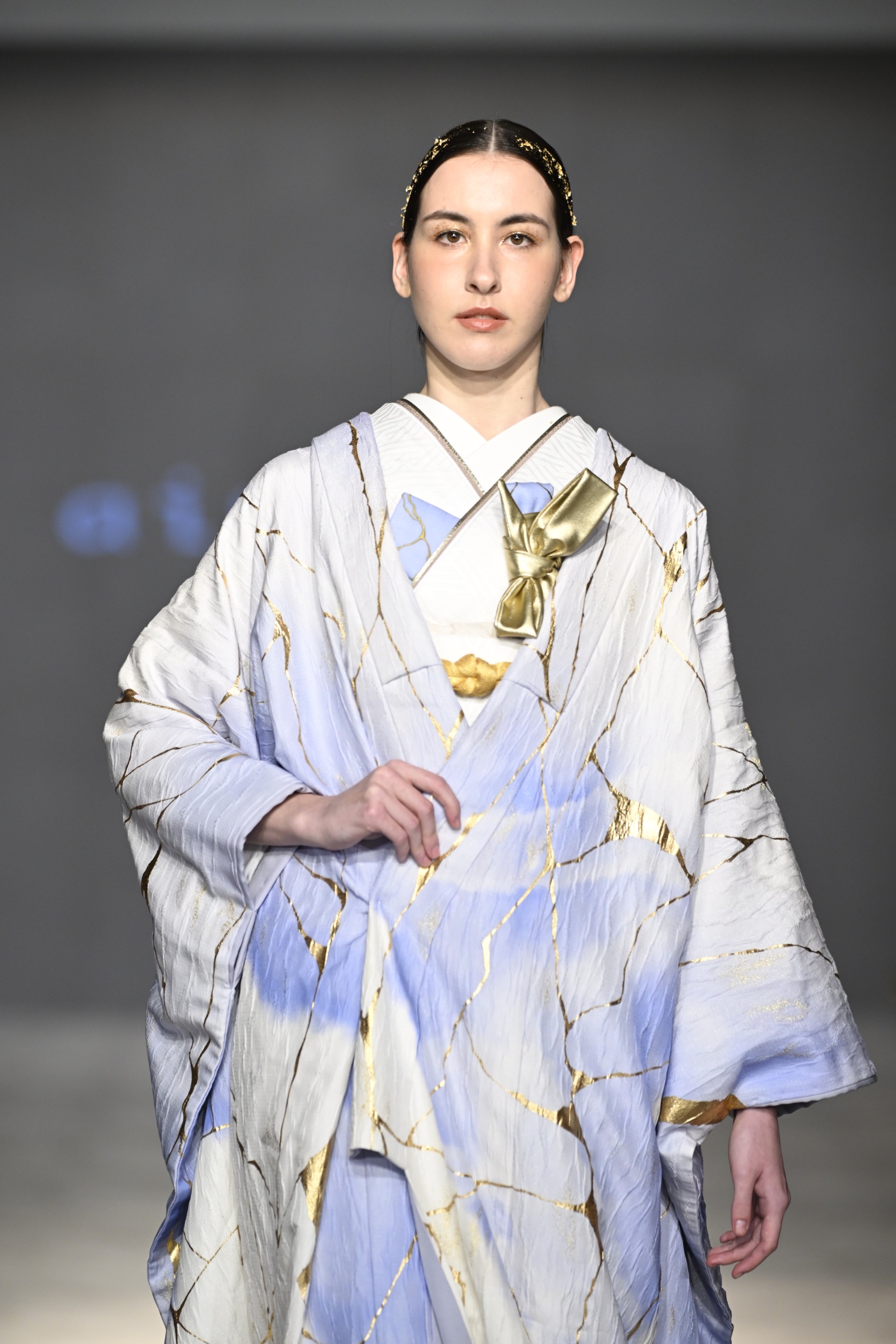 空のような青と白のグラデーションに、 大胆に走る金のラインが、繊細さを描き出す。