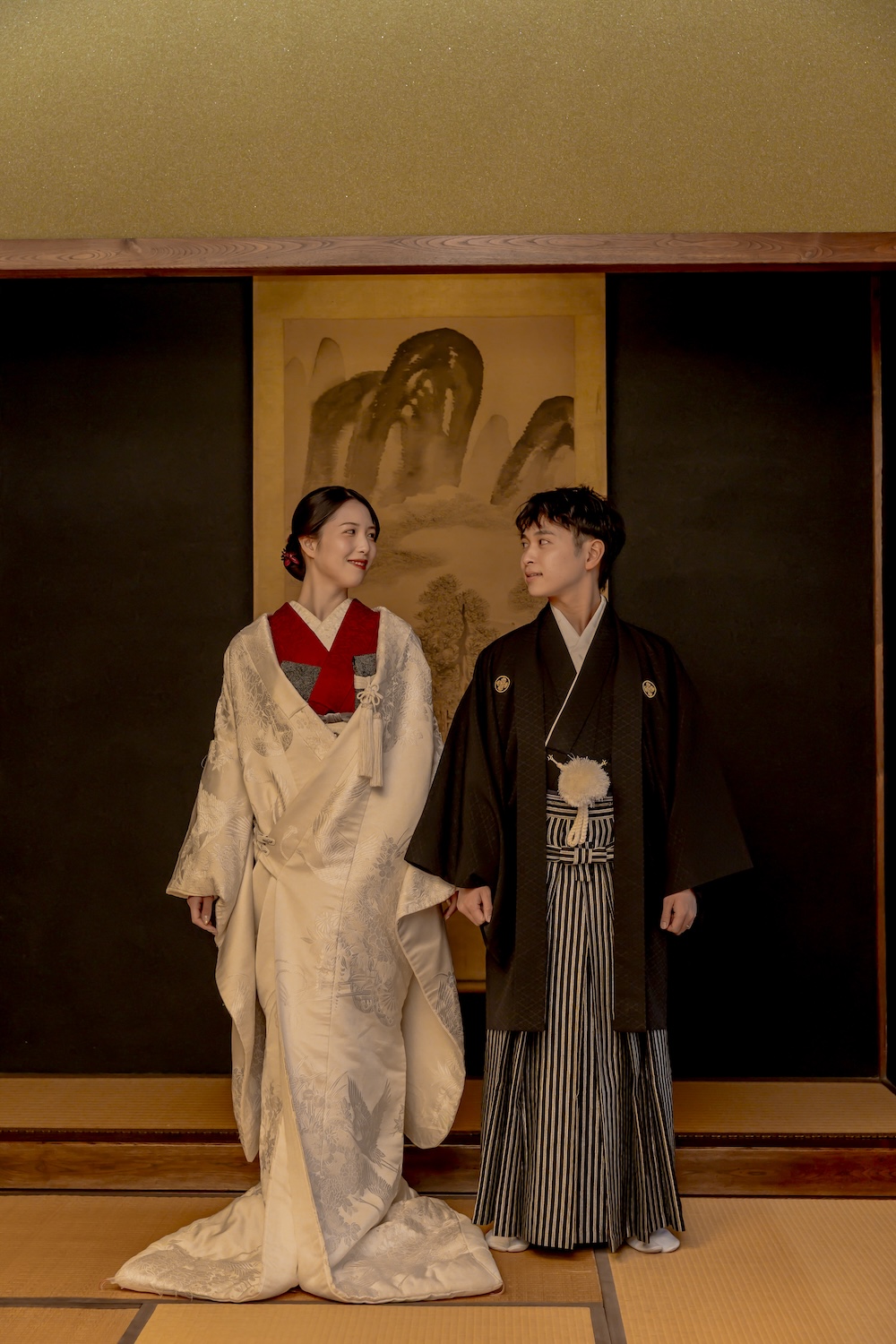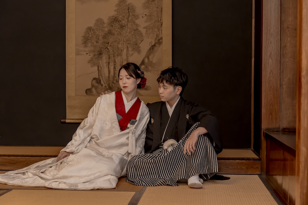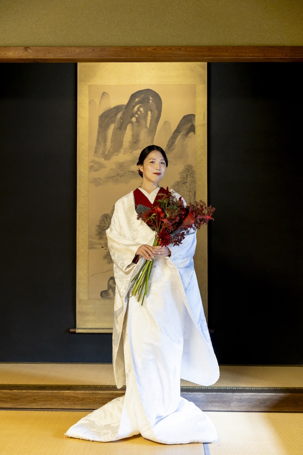 ポージングと演出 掛け軸を背景に並んだ立ち姿は、まるで絵画のような美しさ。おふたりで見つめ合うカットや、深紅のブーケを手にしたソロカットなど、静寂の中に温かさを感じるお写真に仕上がりました。
