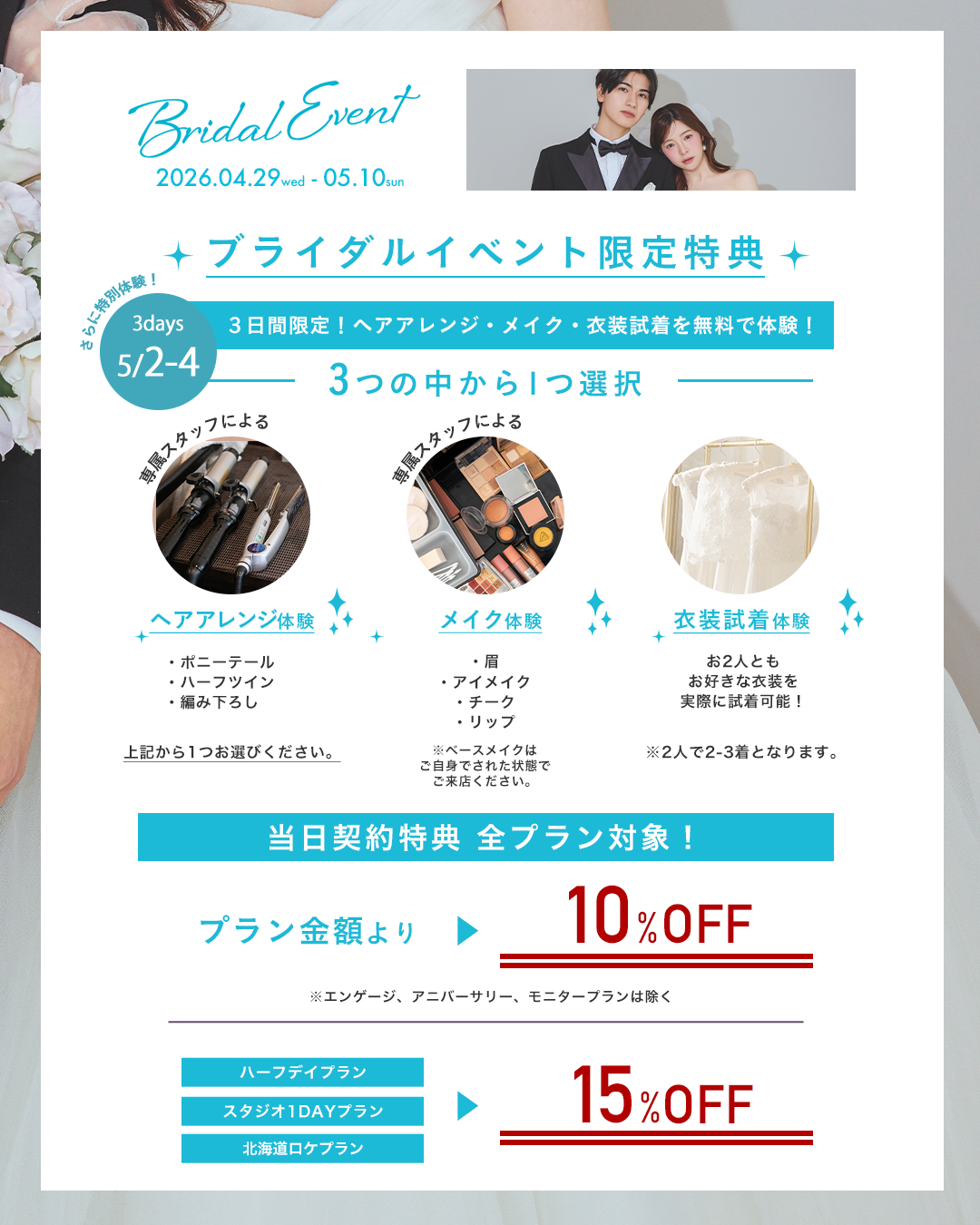 今回は、4月29日(水祝) 〜5月10日(日)の12日間で開催されますブライダルイベントを紹介いたします!